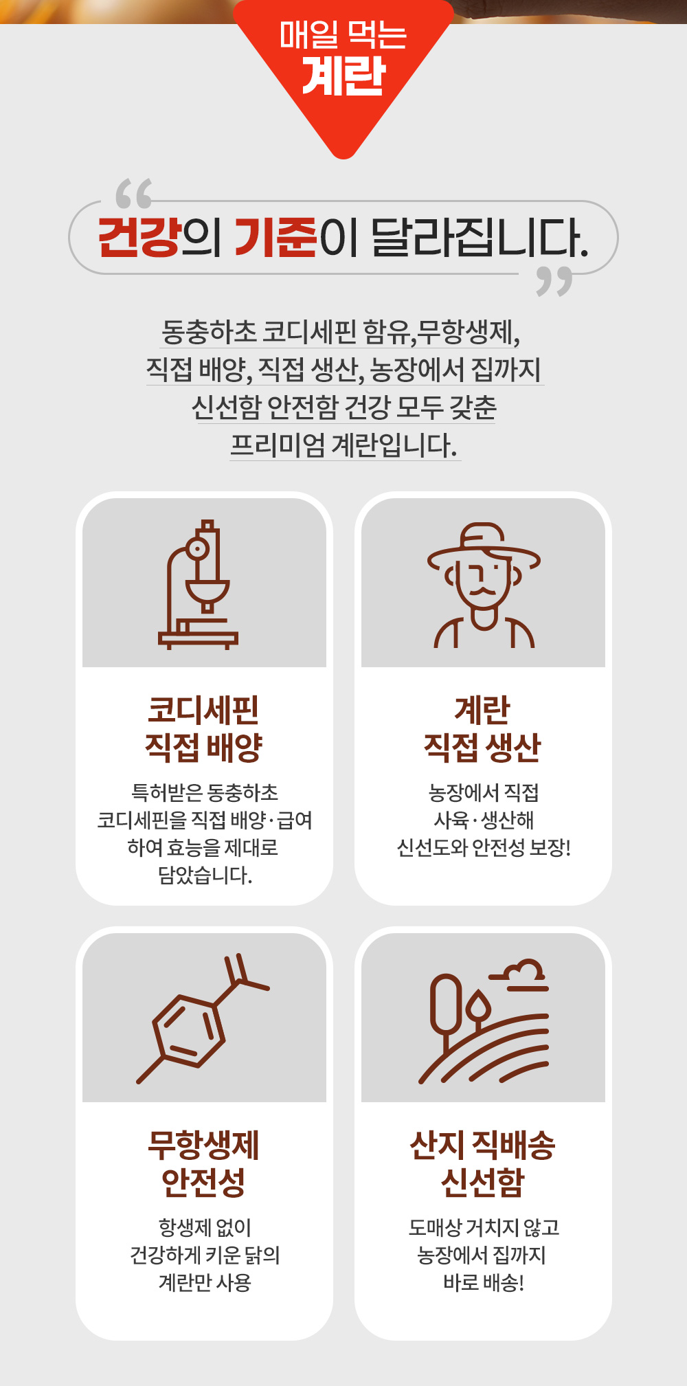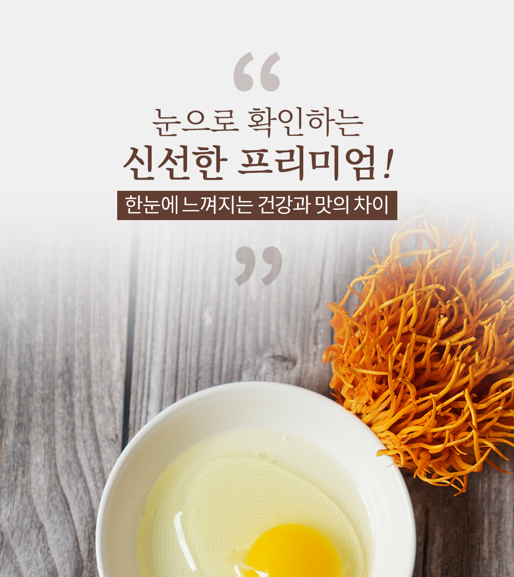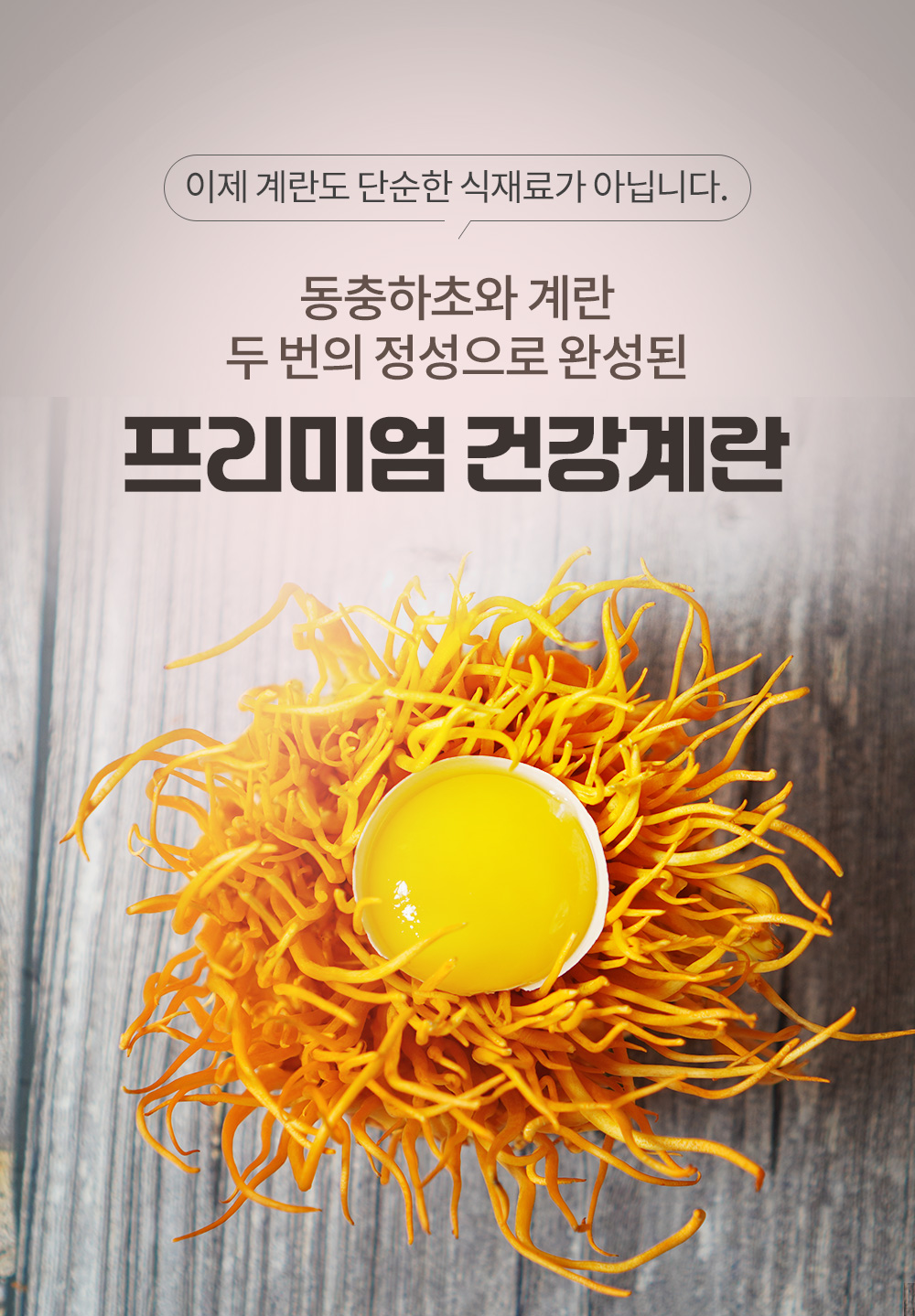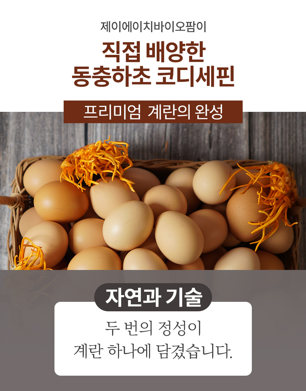 동충하초 코디세핀 함유, 무항생제, 직접 배양, 직접 생산, 농장에서 집까지 신선함 안전함 건강 모두 갖춘 프리미엄 계란입니다.