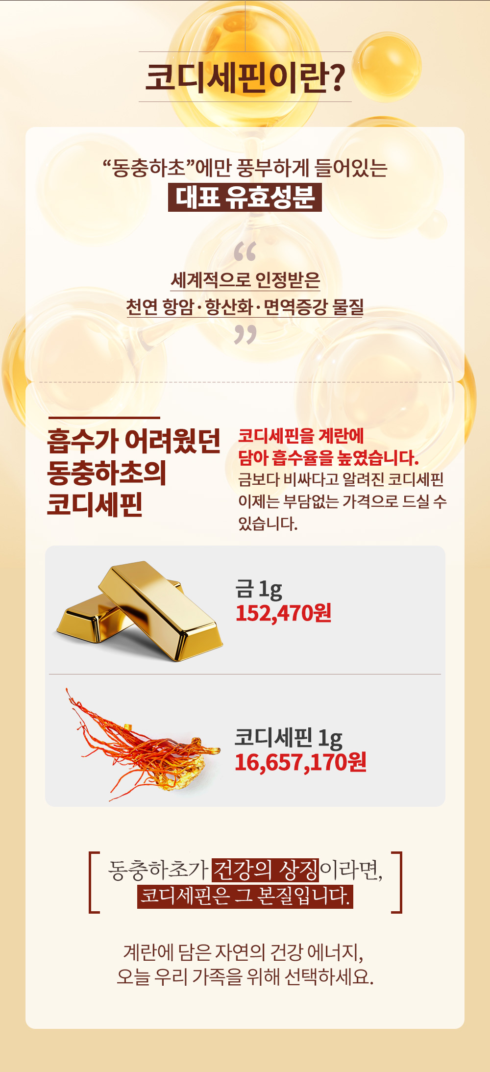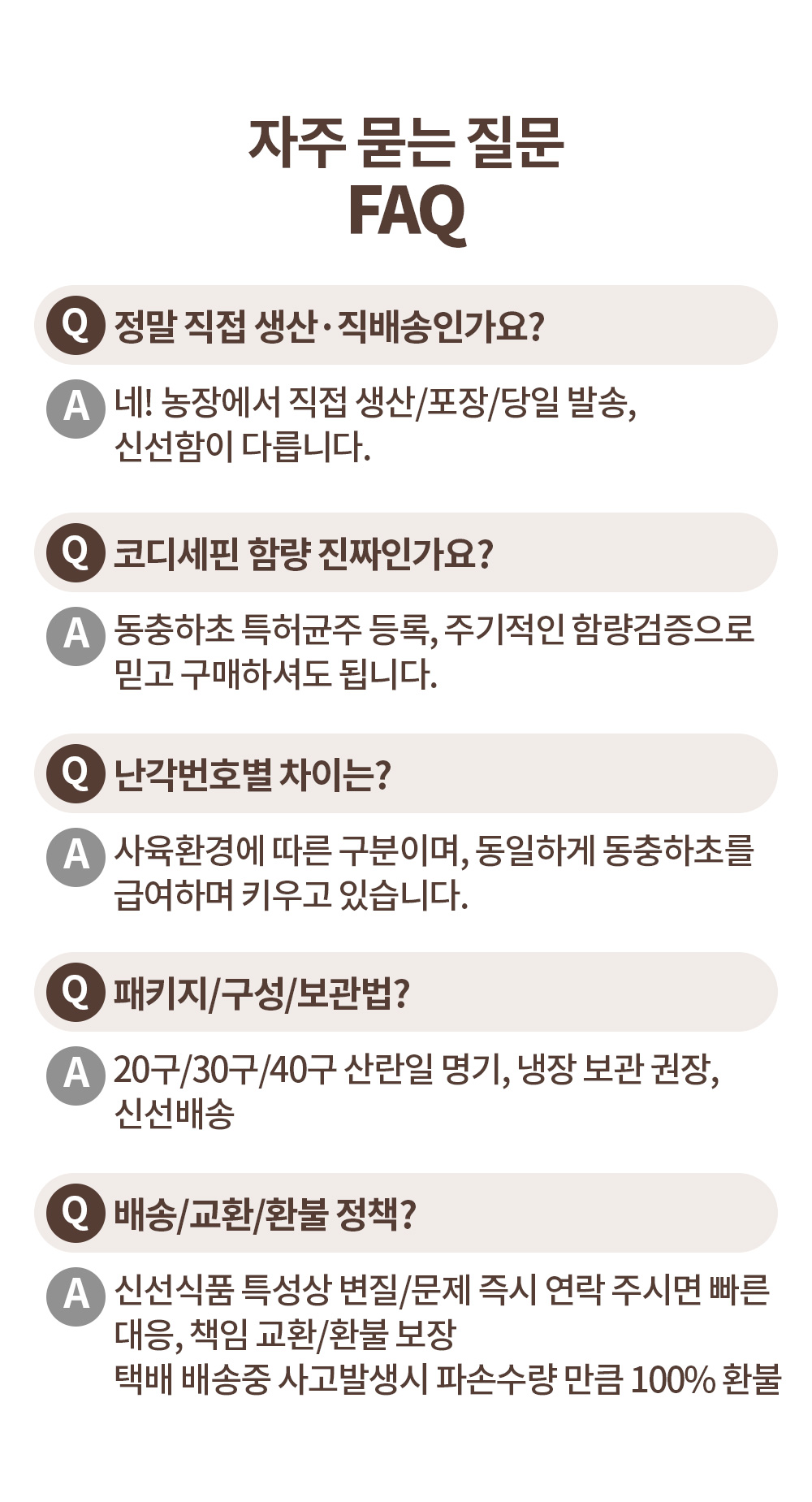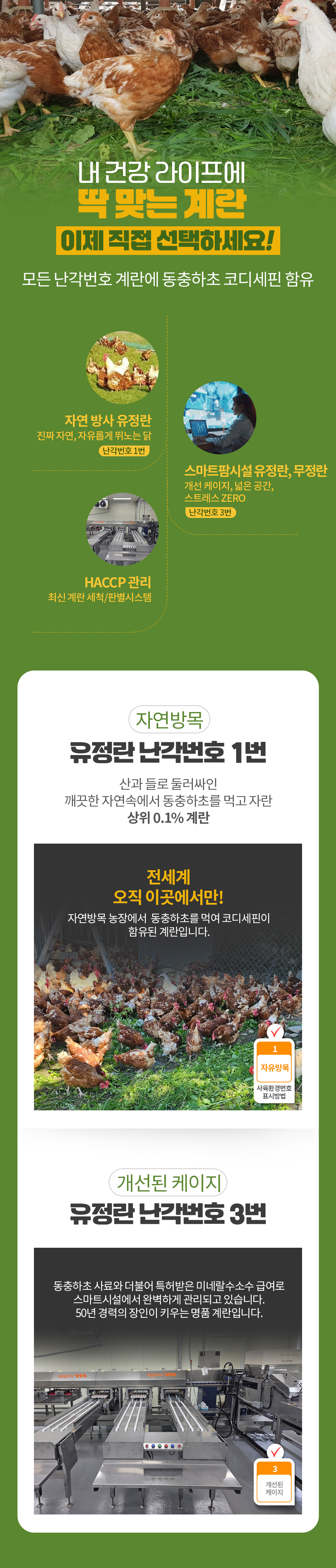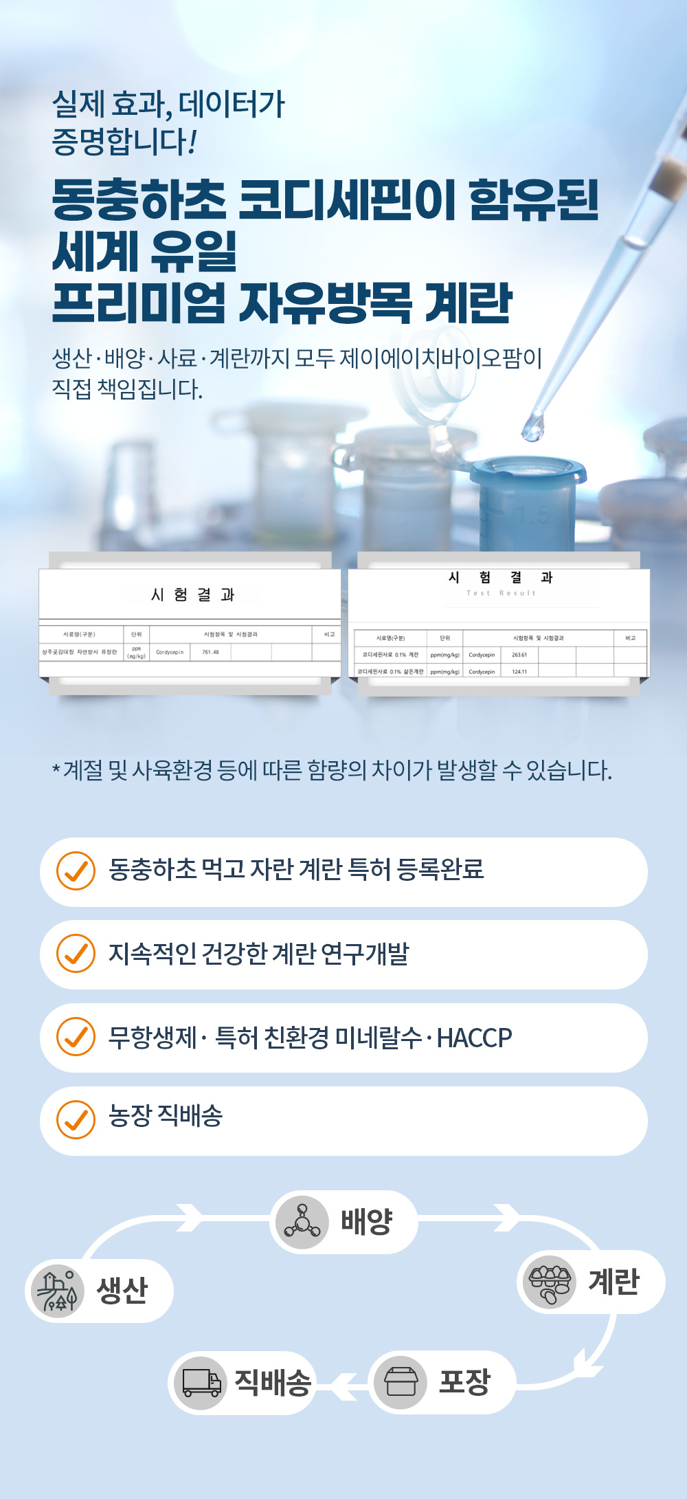 동충하초 코디세핀 함유, 무항생제, 직접 배양, 직접 생산, 농장에서 집까지 신선함 안전함 건강 모두 갖춘 프리미엄 계란입니다.